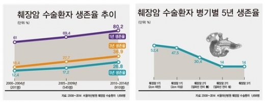 하지만 췌장암의 생존율은 12.6%에 불과하다. 생존율 자체만 두고 봐도 가장 낮아서 '치명적인 암'으로 불린다(국가암정보센터 자료). 대부분의 선진국이 10% 미만이고 미국도 10% (2009~2015년)에 그치고 있다는 점을. 지난 30여 년 동안 변하지 않은 수치다. 췌장암 1기 생존율은 30%, 췌장암 2기 생존율은 15% 라고 합니다. 췌장암 조기 발견에 도움을 주는 혈액검사는 아직 개발되지 않았다. 치료법도 수술 외에는 확실한 것이 없어서 췌장암은 '걸리면 무조건 죽는 암'이라는 인식이 강하다. 故 유상철 전 인천 유나이티드 감독의 빈소가 8일 서울 아산병원 장례식장에 마련되어 있다. 국가암정보센터 자료에 따르면 췌장암 환자의 5년 상대생존율 (연도·성별·연령이 같은 일반인과 비교해 암환자가 5년간 생존할 확률)은 2010년까지 8%대에서 2013~2017년 12.2%로 높아졌다. 사람의 나이, 전반적인 건강, 암에 치료에 얼마나 잘 반응하는지 같은 요인을 배제합니다. 최근 5년간 진단받은 전체 암환자의 5년 상대생존율(생존율)은 70.3%이다. 名醫 인터뷰윤동섭 대한간담췌외과학회 차기 이사장. 10년 전과 비교하면 위암의 생존율은 58.0% → 77.0%, 간암 20.5% → 37.0%, 폐암 16.6% → 32.4%으로 크게 올랐다.